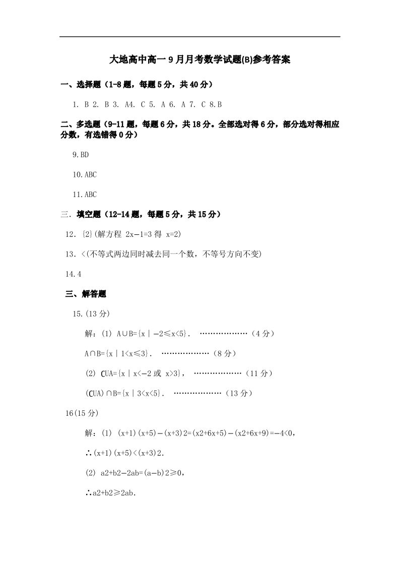 高一数学(B)答案--山西省朔州市怀仁市大地高中学校2025-2026学年高一上学期第一次月考