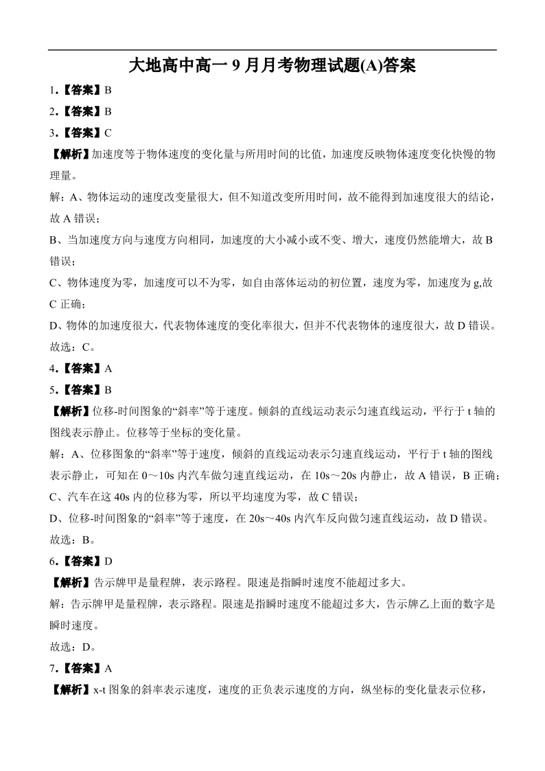 高一物理(A)答案--山西省朔州市怀仁市大地高中学校2025-2026学年高一上学期第一次月考