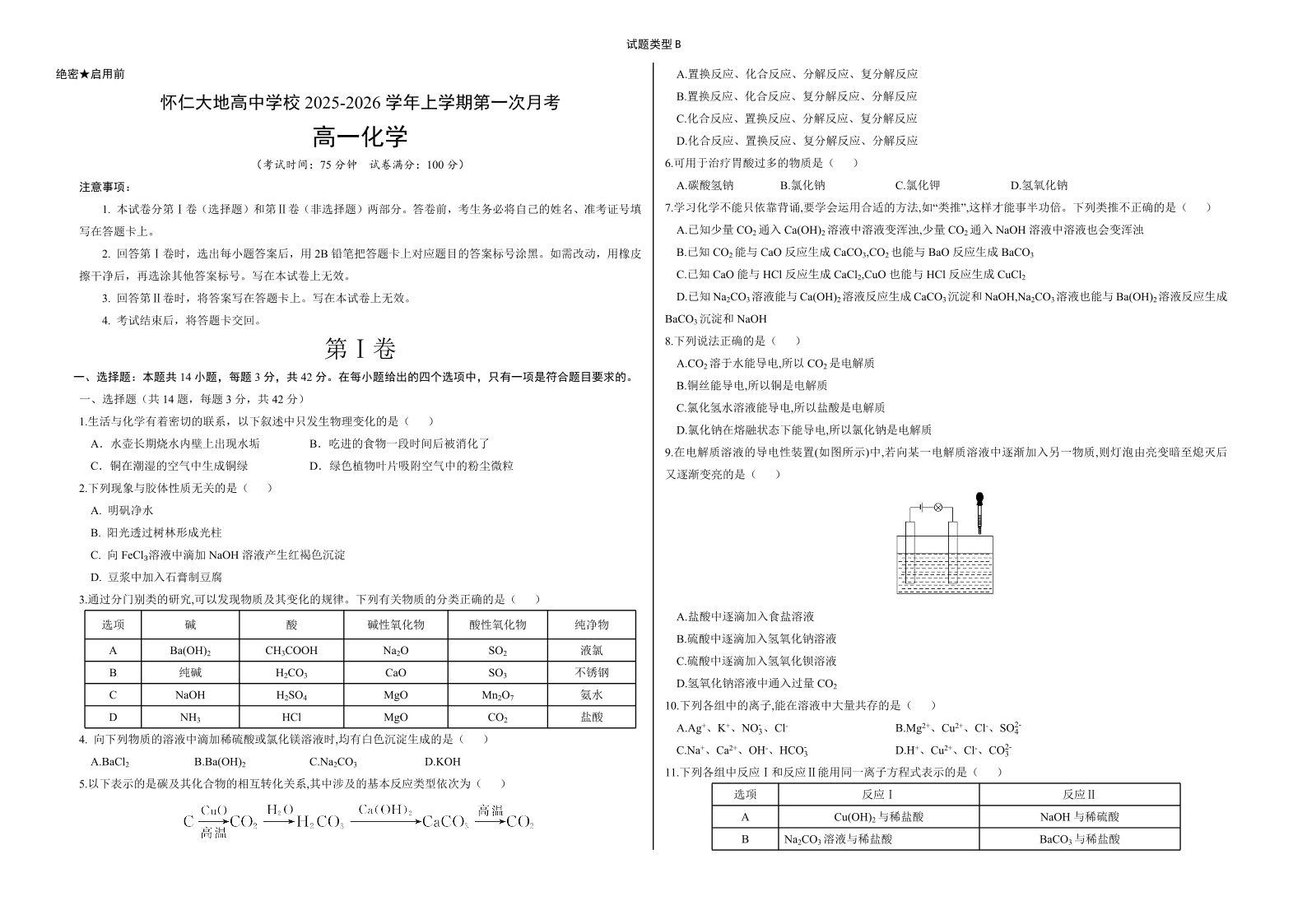 高一化学--山西省朔州市怀仁市大地高中学校2025-2026学年高一上学期第一次月考