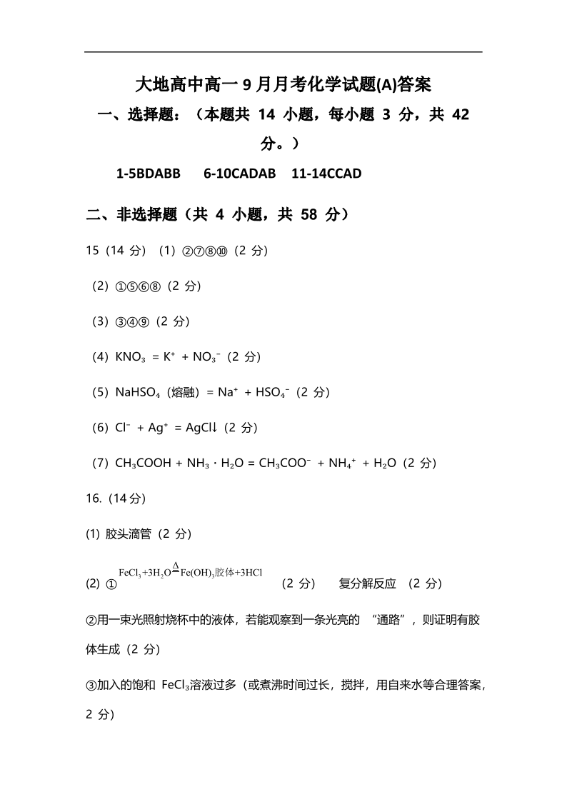 高一化学(A)答案--山西省朔州市怀仁市大地高中学校2025-2026学年高一上学期第一次月考