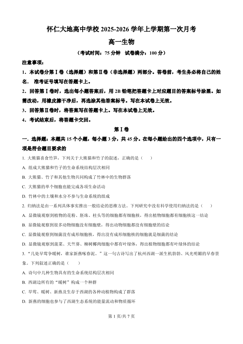 高一生物(原卷版)--山西省朔州市怀仁市大地高中学校2025-2026学年高一上学期第一次月考