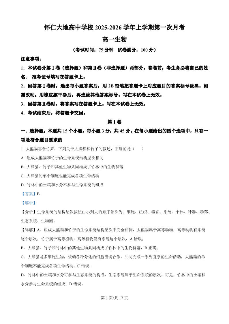高一生物(精品解析版)--山西省朔州市怀仁市大地高中学校2025-2026学年高一上学期第一次月考