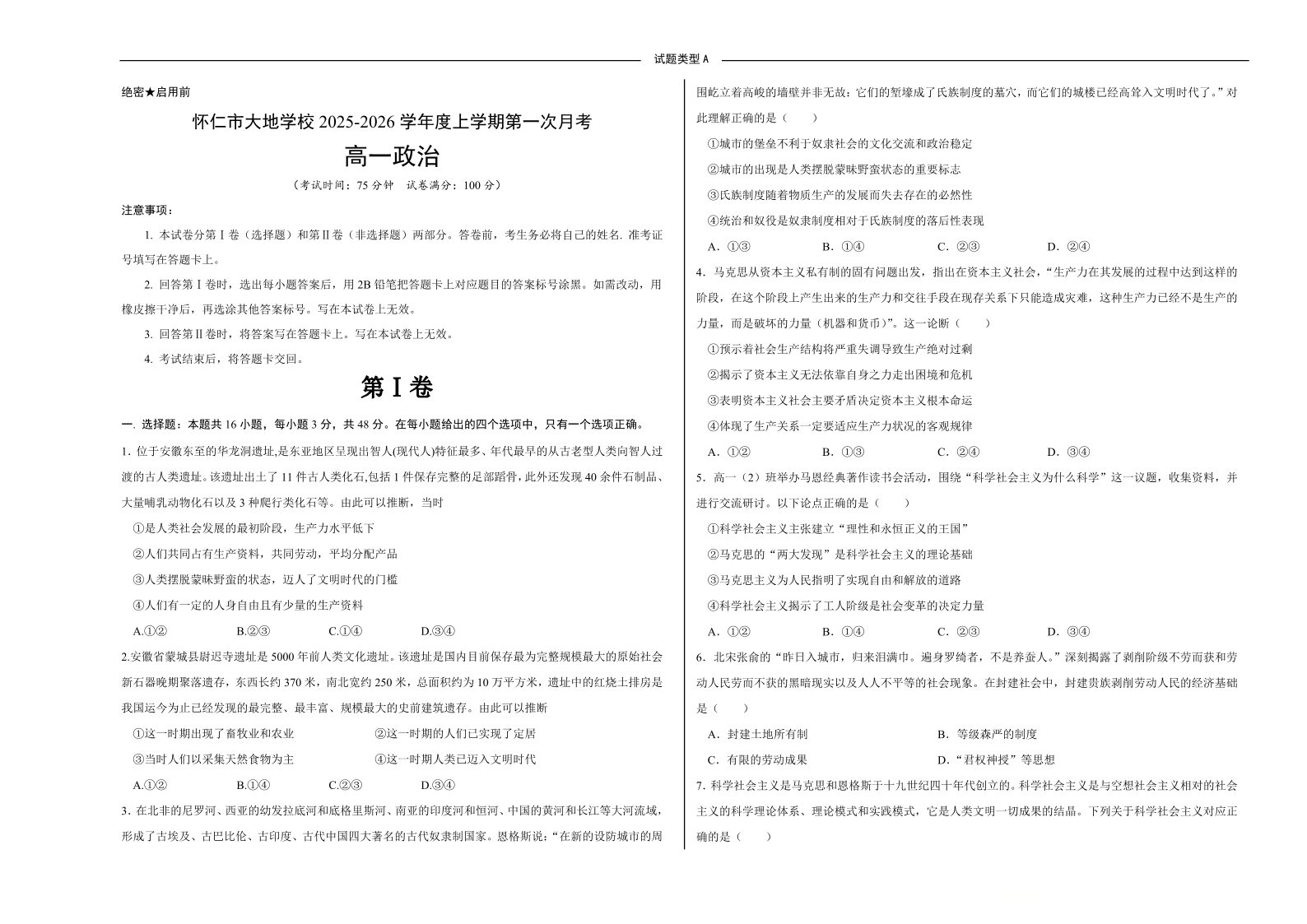 高一政治--山西省朔州市怀仁市大地高中学校2025-2026学年高一上学期第一次月考