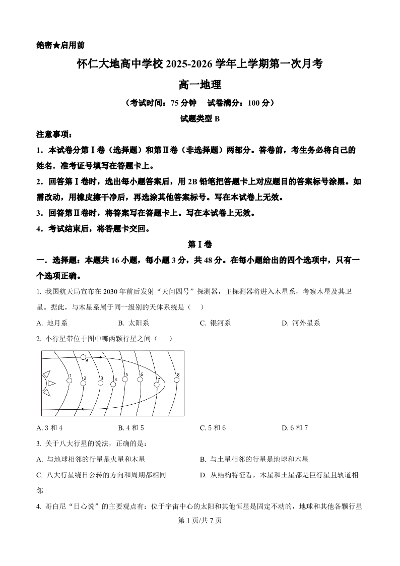 高一地理B卷(原卷版)--山西省朔州市怀仁市大地高中学校2025-2026学年高一上学期第一次月考