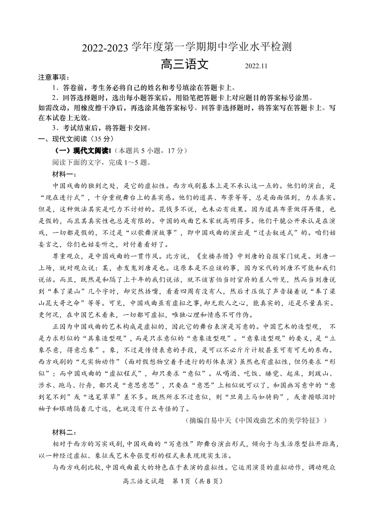 高三语文--山东省青岛区域2023届高三上学期期中考试