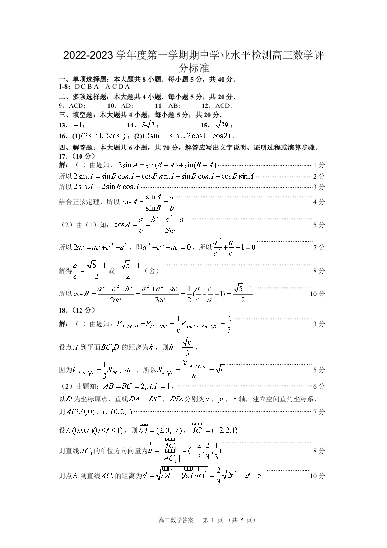 高三数学答案--山东省青岛区域2023届高三上学期期中考试
