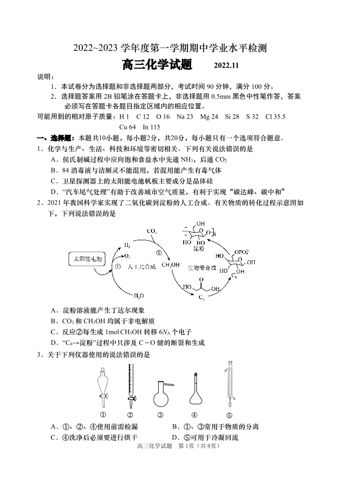 高三化学--山东省青岛区域2023届高三上学期期中考试