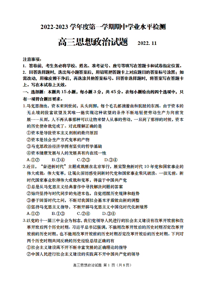 高三政治--山东省青岛区域2023届高三上学期期中考试
