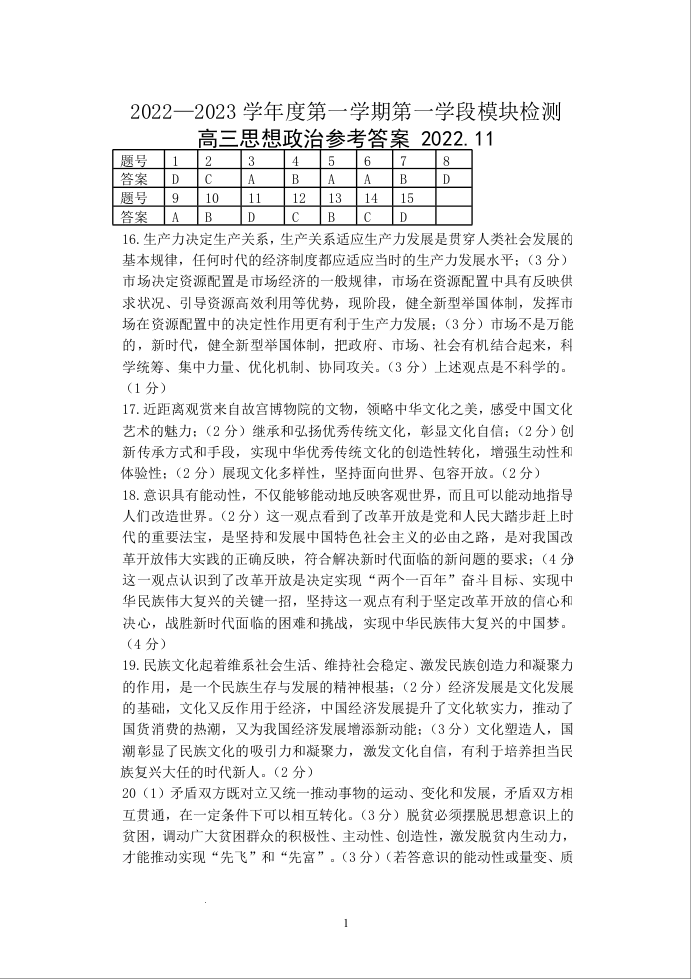 高三政治答案--山东省青岛区域2023届高三上学期期中考试