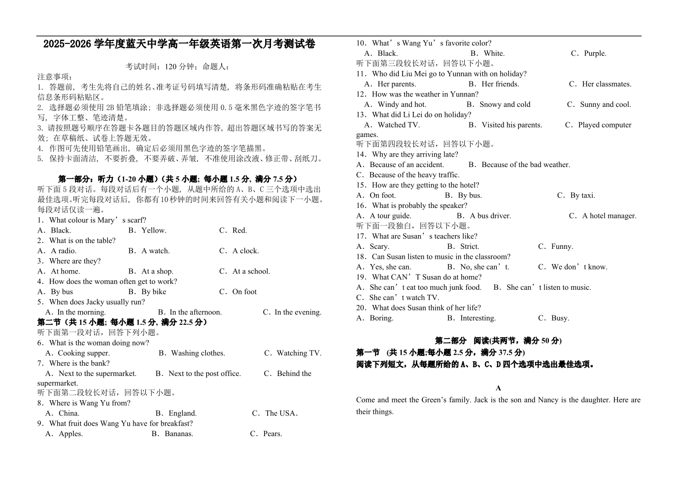 高一英语--江西省上饶市余干县私立蓝天中学2025-2026学年高一上学期第一次月考