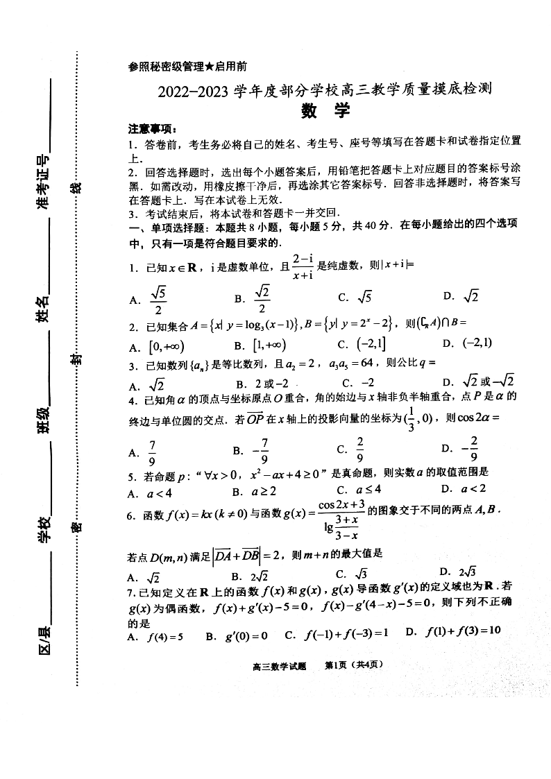 高三数学--山东省淄博市部分学校2022-2023学年高三上学期12月教学质量摸底检测