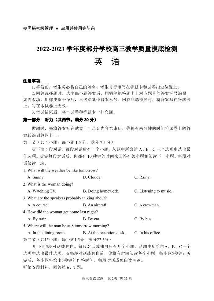 高三英语--山东省淄博市部分学校2022-2023学年高三上学期12月教学质量摸底检测