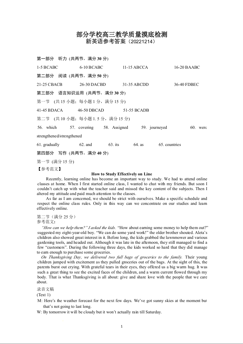 高三英语答案--山东省淄博市部分学校2022-2023学年高三上学期12月教学质量摸底检测