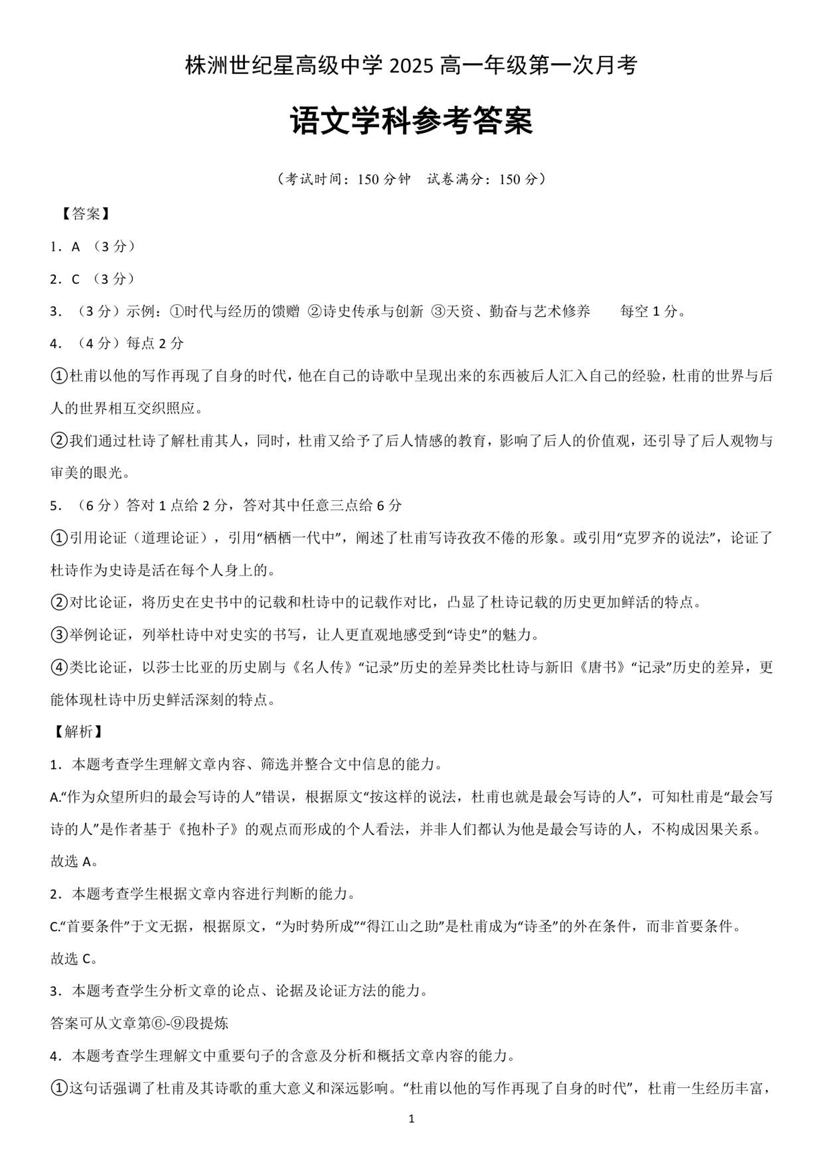 高一语文答案--湖南省株洲世纪星高级中学2025-2026学年高一上学期第一次月考
