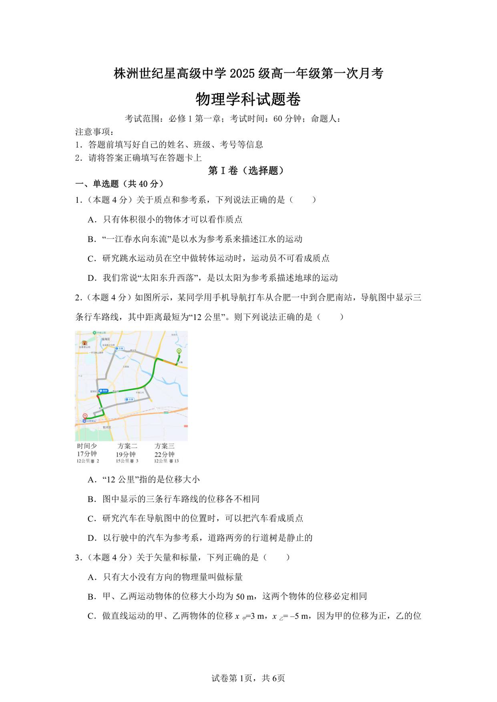 高一物理--湖南省株洲世纪星高级中学2025-2026学年高一上学期第一次月考