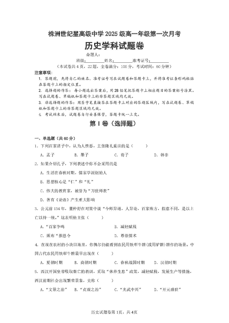 高一历史--湖南省株洲世纪星高级中学2025-2026学年高一上学期第一次月考
