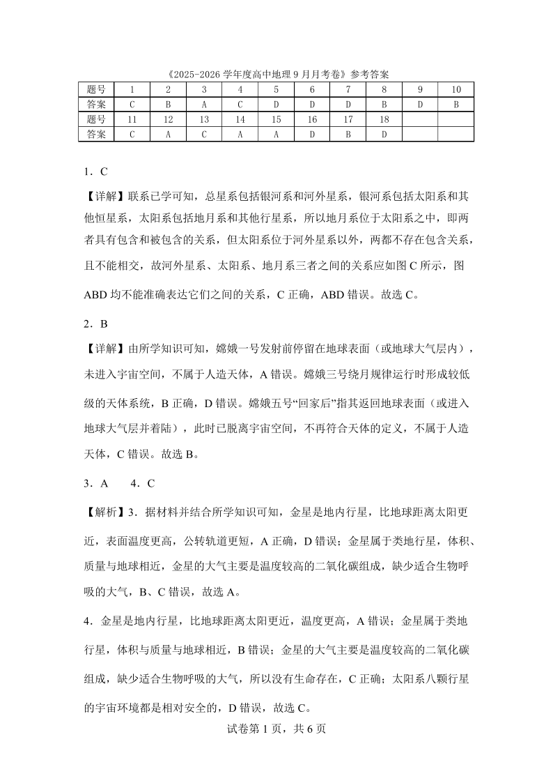 高一地理答案--湖南省株洲世纪星高级中学2025-2026学年高一上学期第一次月考