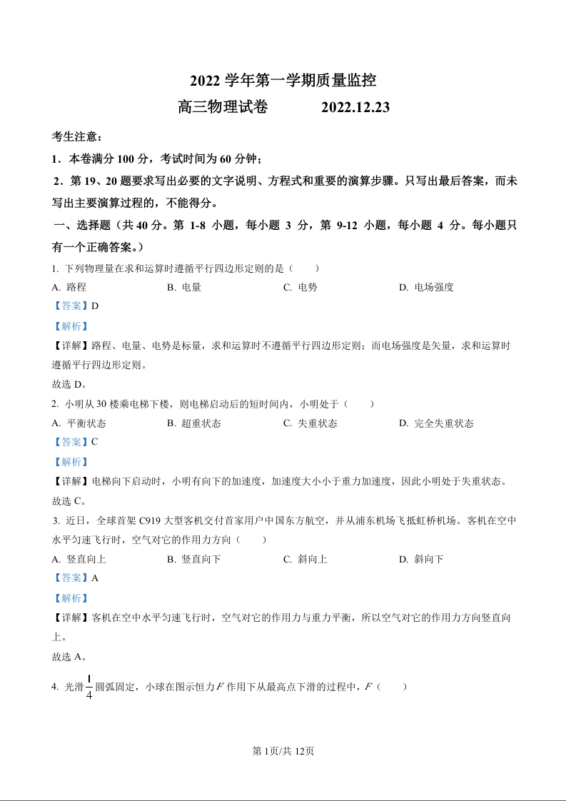 高三物理(精品解析版)-上海市金山区2023届高三上学期第一次质量调研(一模)