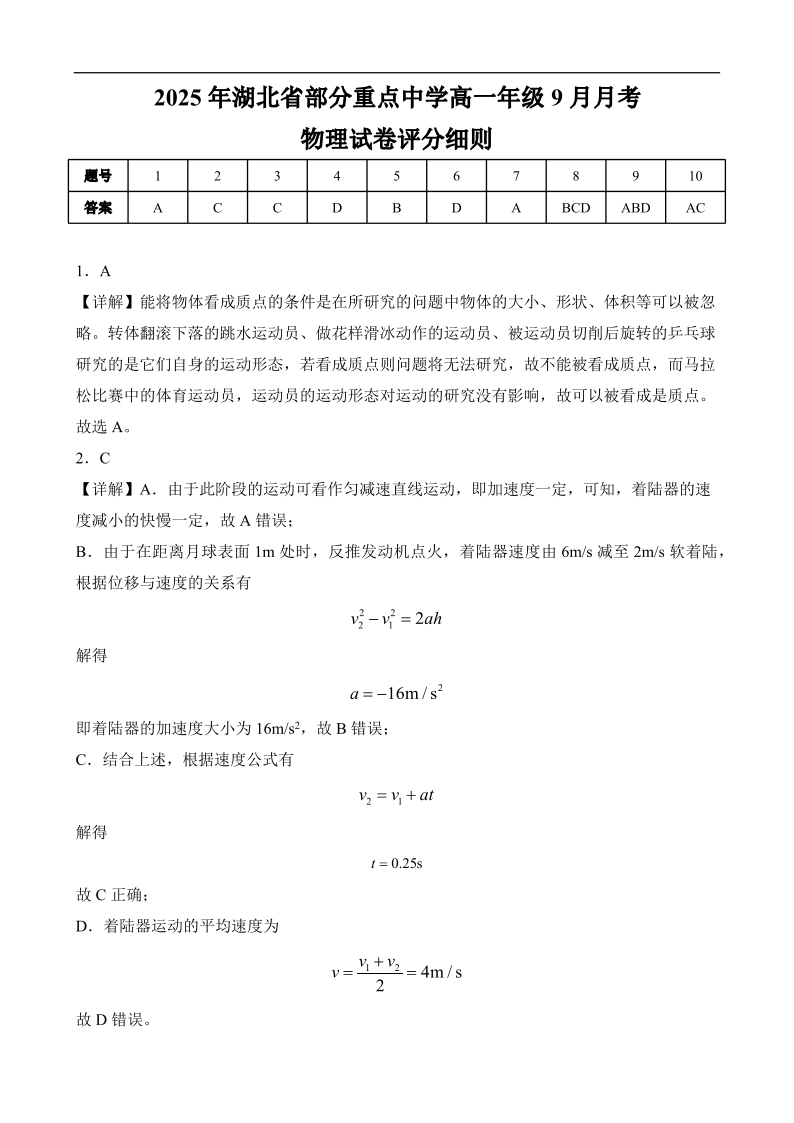 高一物理答案--湖北省咸宁市华师元一赤壁学校2025-2026学年高一上学期9月月考