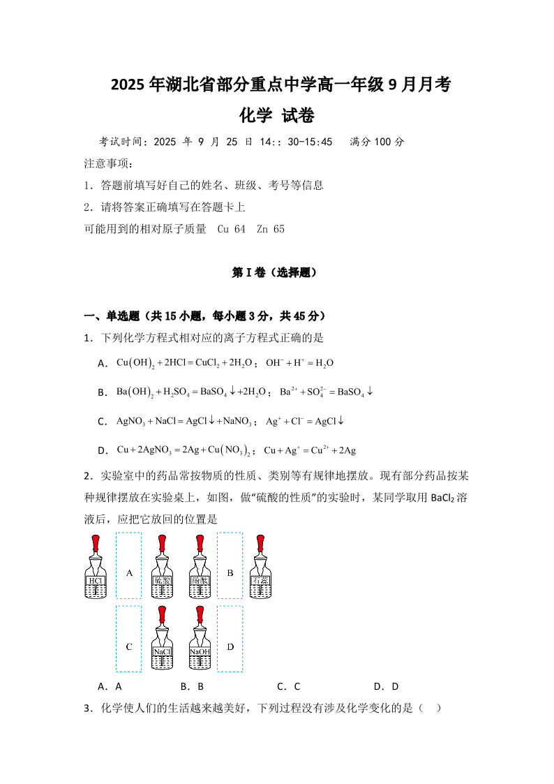 高一化学+答案--湖北省咸宁市华师元一赤壁学校2025-2026学年高一上学期9月月考