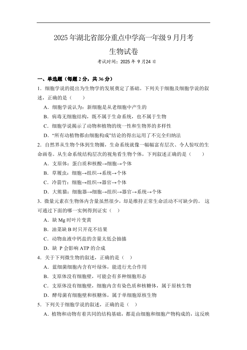 高一生物--湖北省咸宁市华师元一赤壁学校2025-2026学年高一上学期9月月考