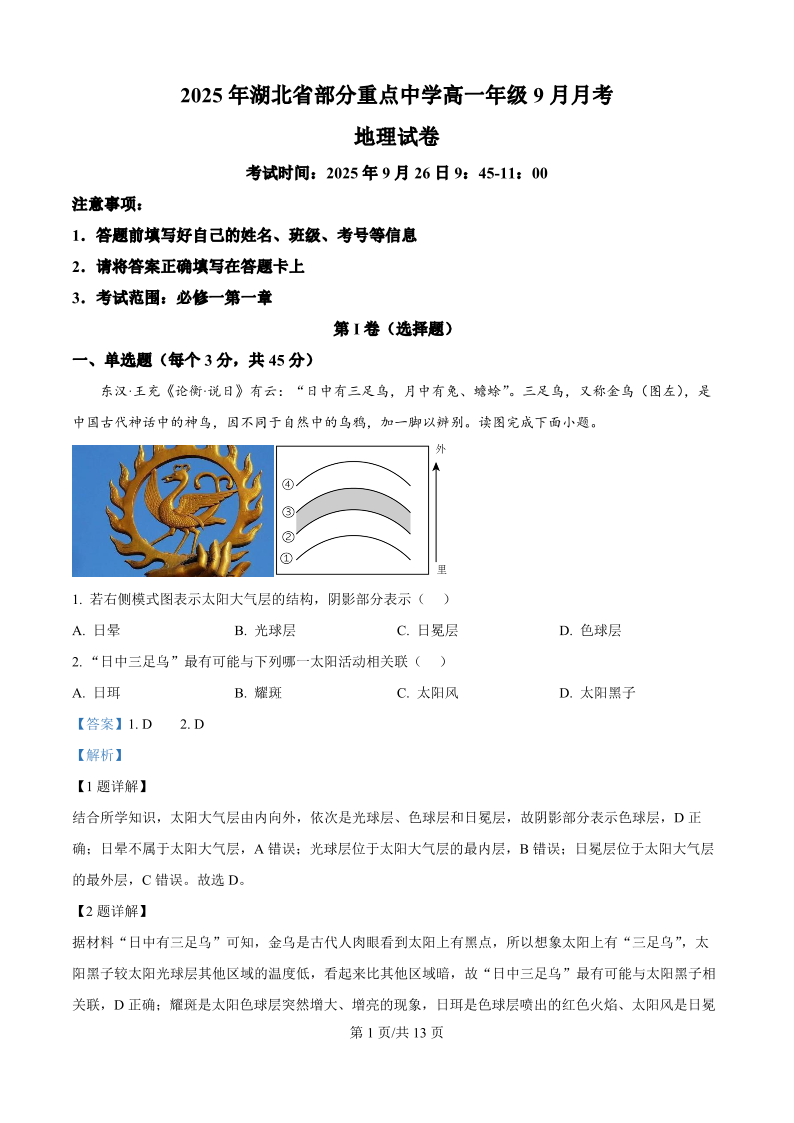 高一地理(精品解析版)--湖北省咸宁市华师元一赤壁学校2025-2026学年高一上学期9月月考