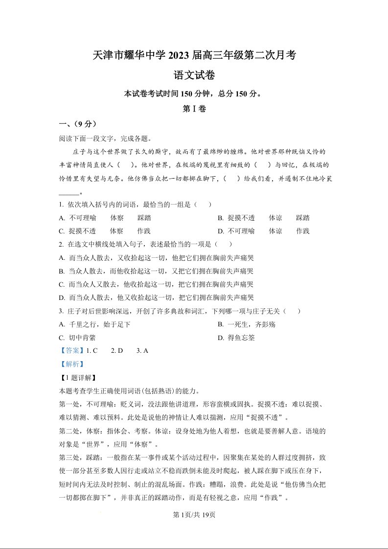 高三语文答案-天津市耀华中学2023高三上学期11月第二次月考