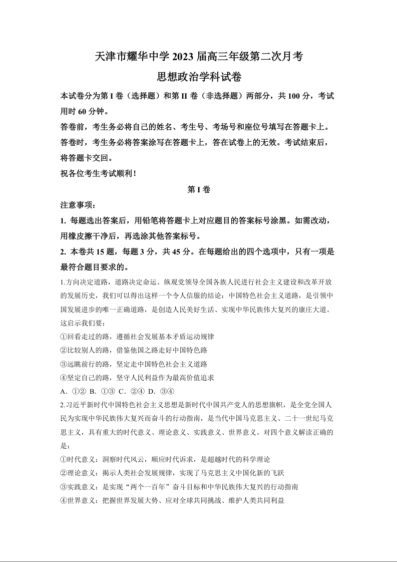高三政治+答案-天津市耀华中学2023高三上学期11月第二次月考