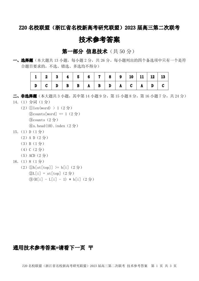 高三技术答案-浙江省Z20名校联盟2023届高三上学期第二次联考