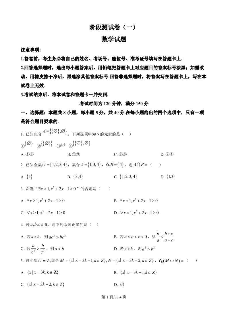 高一数学(原卷版)--黑龙江省双鸭山市部分学校2025-2026学年高一上学期9月月考