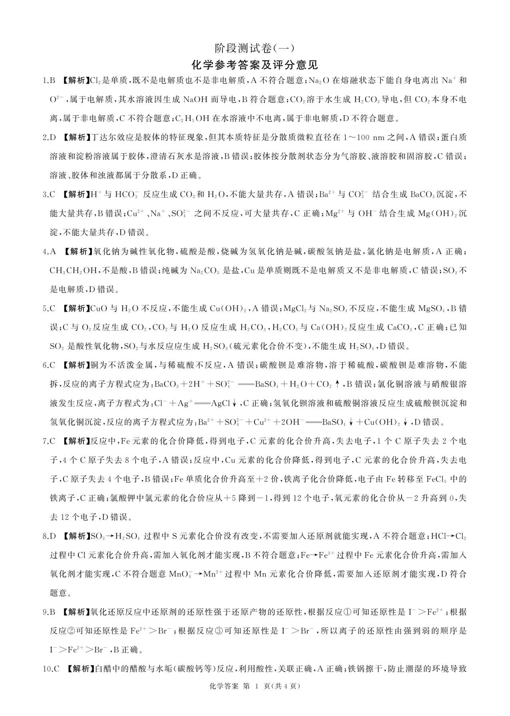 高一化学答案--黑龙江省双鸭山市部分学校2025-2026学年高一上学期9月月考