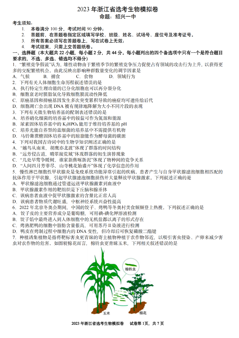 高三生物+答案-浙江省杭州二中、温州中学、金华一中、绍兴一中四校2022-2023学年高三上学期联考