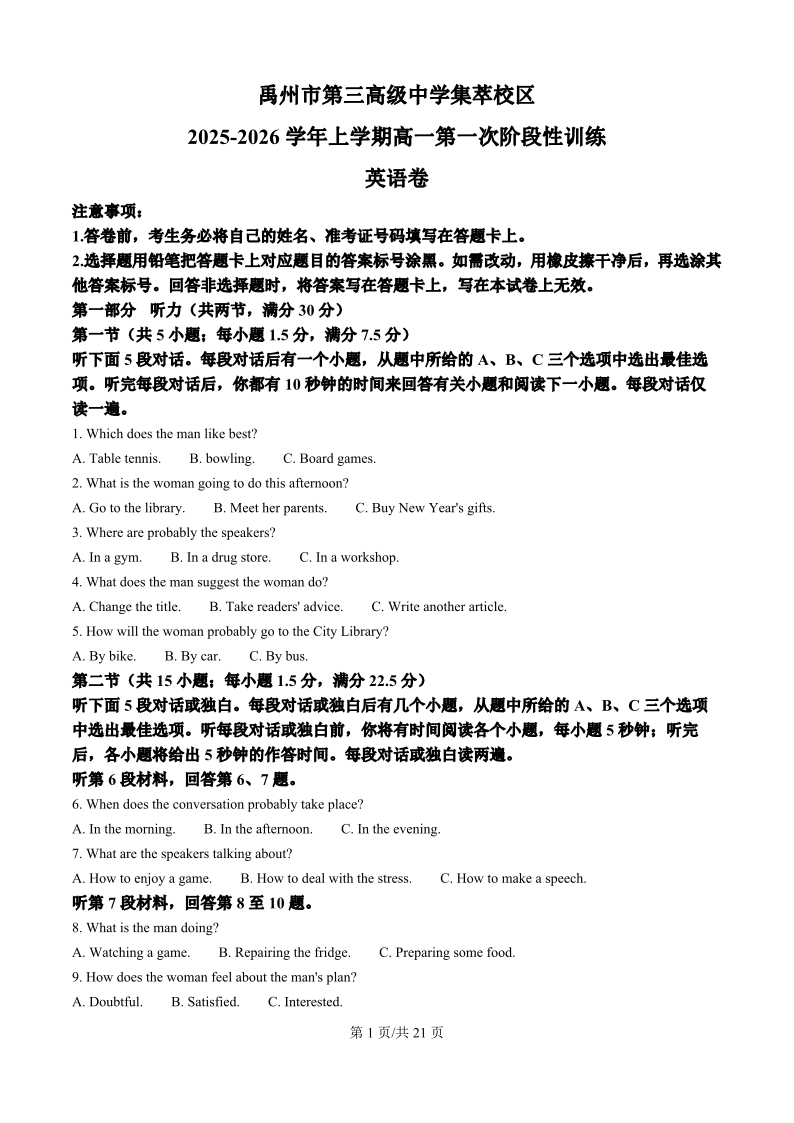 高一英语(精品解析版)--河南省许昌市禹州市第三高级中学2025-2026学年高一上学期9月月考