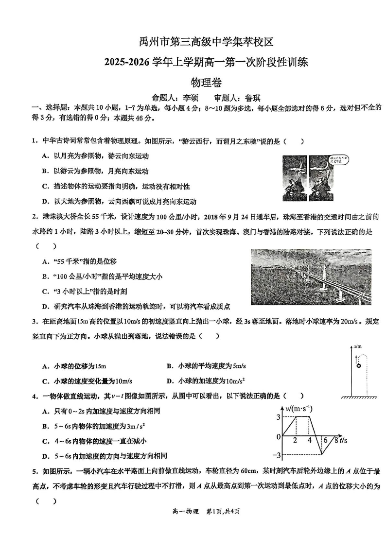 高一物理+答案--河南省许昌市禹州市第三高级中学2025-2026学年高一上学期9月月考