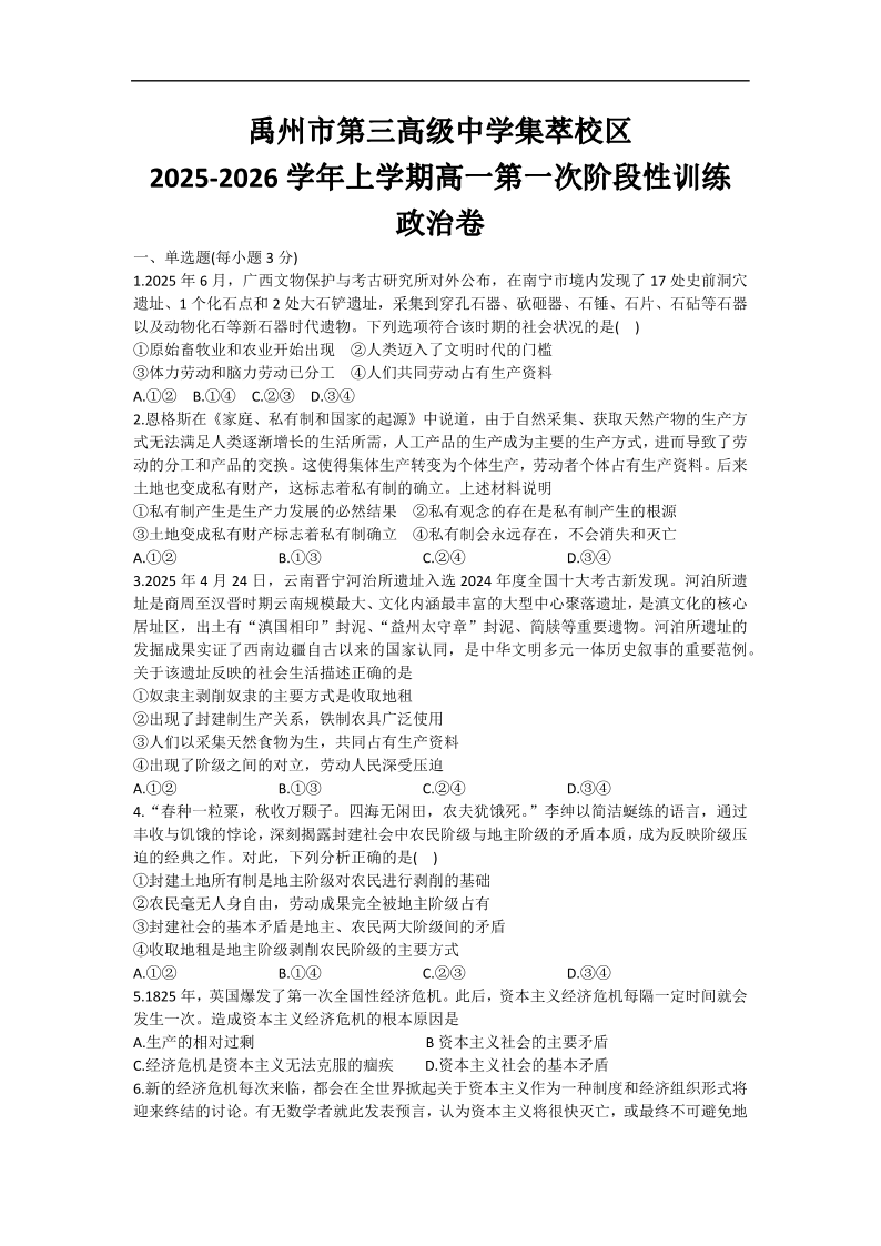 高一政治+答案--河南省许昌市禹州市第三高级中学2025-2026学年高一上学期9月月考