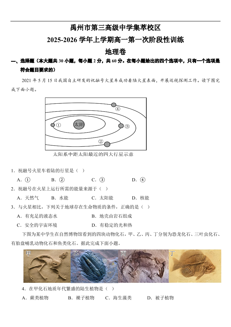 高一地理+答案--河南省许昌市禹州市第三高级中学2025-2026学年高一上学期9月月考