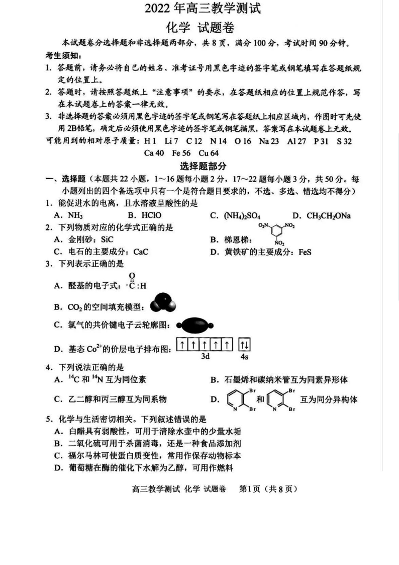 高三化学+答案-浙江省嘉兴市2023届高三上学期12月教学测试试题(一模)