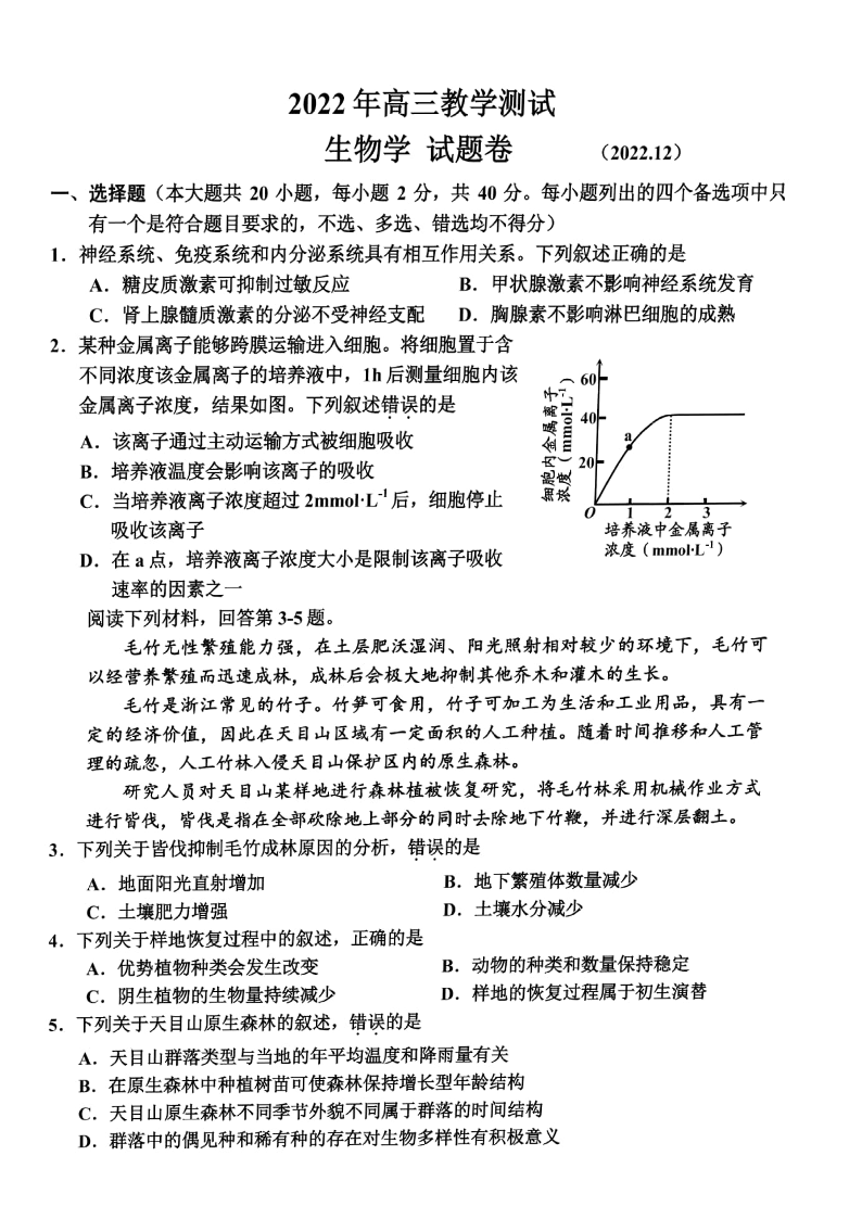 高三生物+答案-浙江省嘉兴市2023届高三上学期12月教学测试试题(一模)