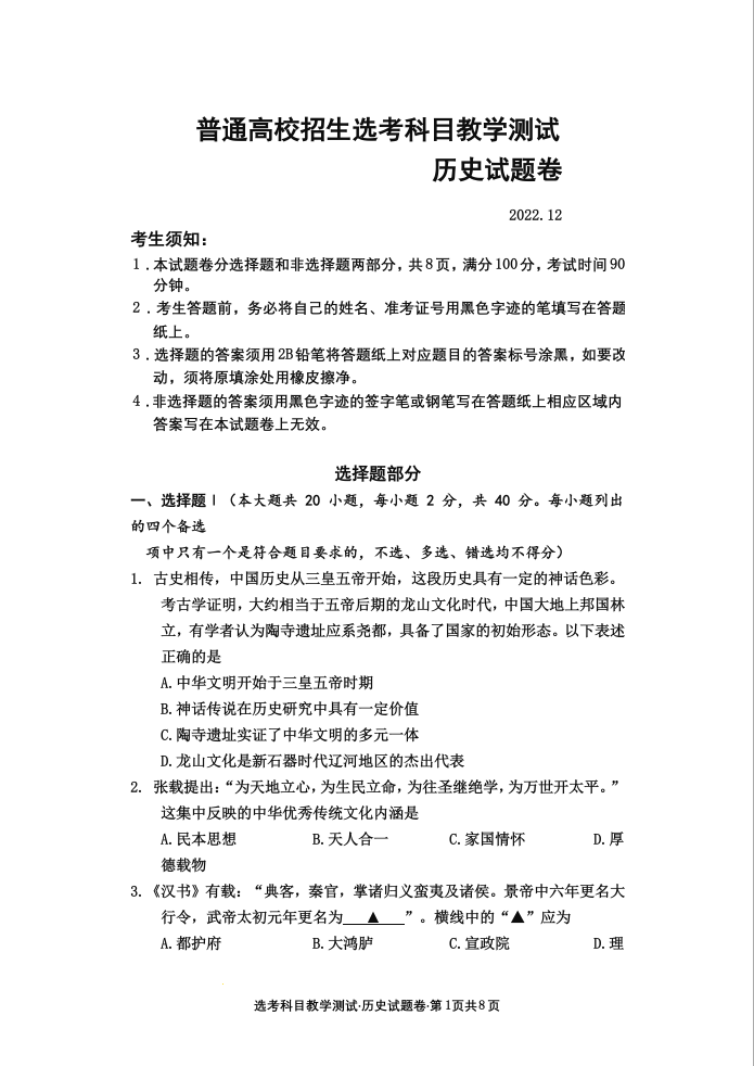 高三历史+答案-浙江省嘉兴市2023届高三上学期12月教学测试试题(一模)
