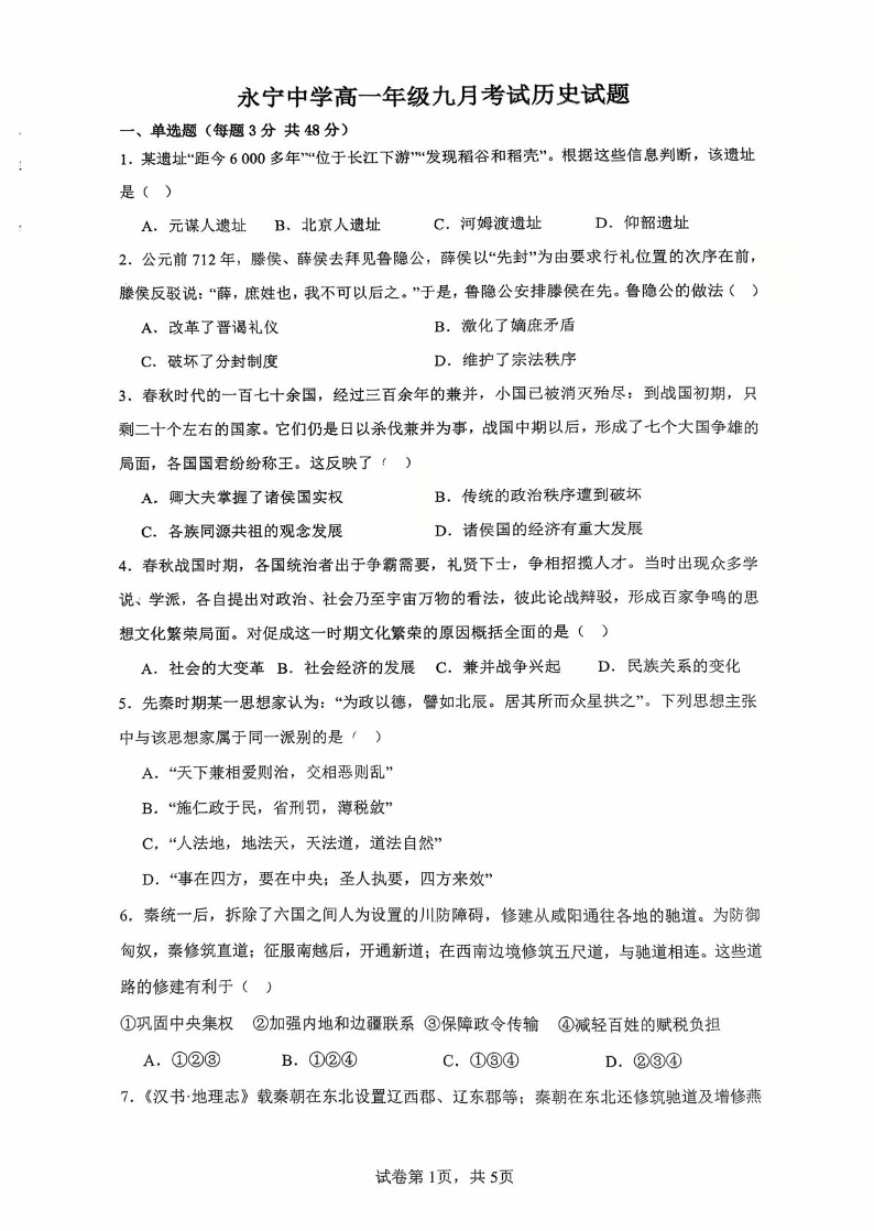 高一历史--河北省保定市部分学校2025-2026学年高一上学期9月月考