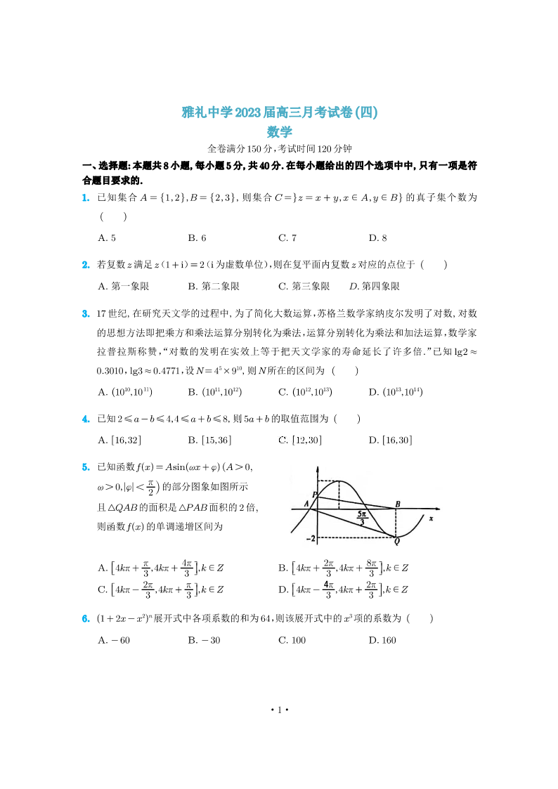 高三数学+答案-湖南省长沙市雅礼中学2022-2023学年高三上学期月考卷(四)