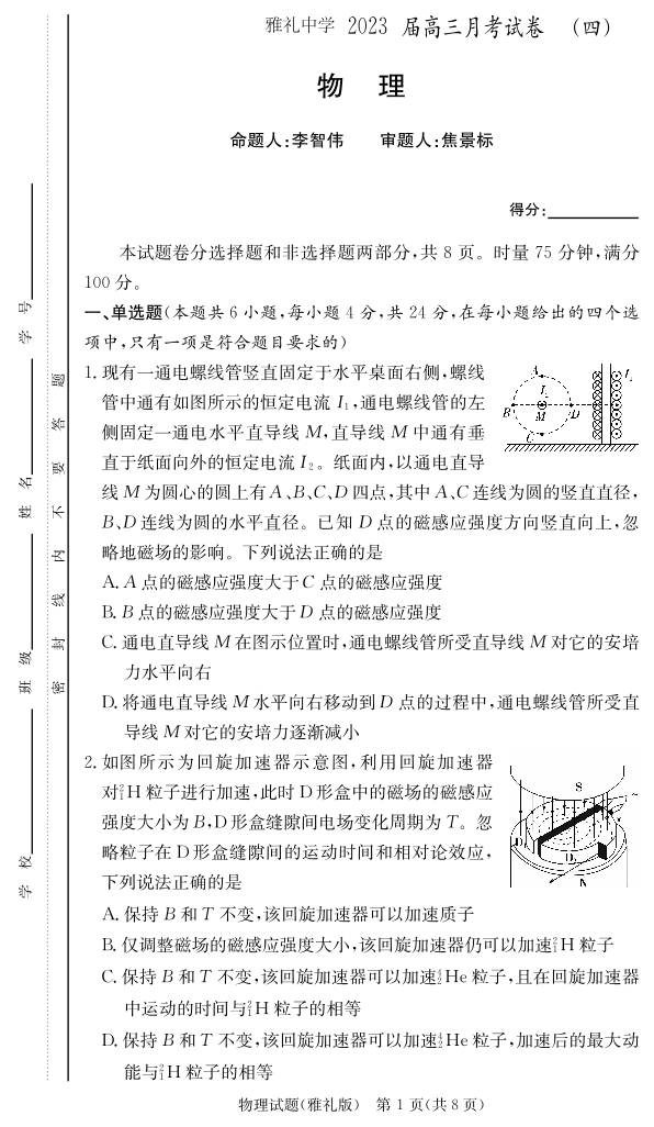 高三物理+答案-湖南省长沙市雅礼中学2022-2023学年高三上学期月考卷(四)