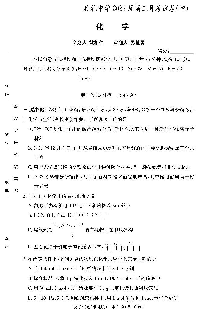 高三化学-湖南省长沙市雅礼中学2022-2023学年高三上学期月考卷(四)