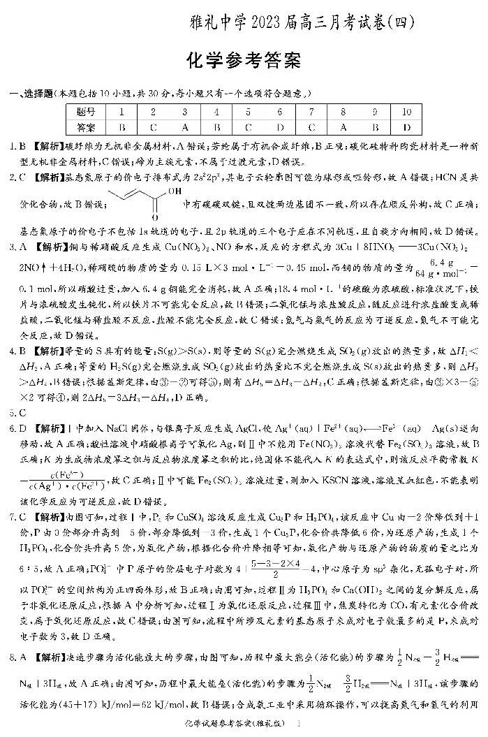 高三化学答案-湖南省长沙市雅礼中学2022-2023学年高三上学期月考卷(四)