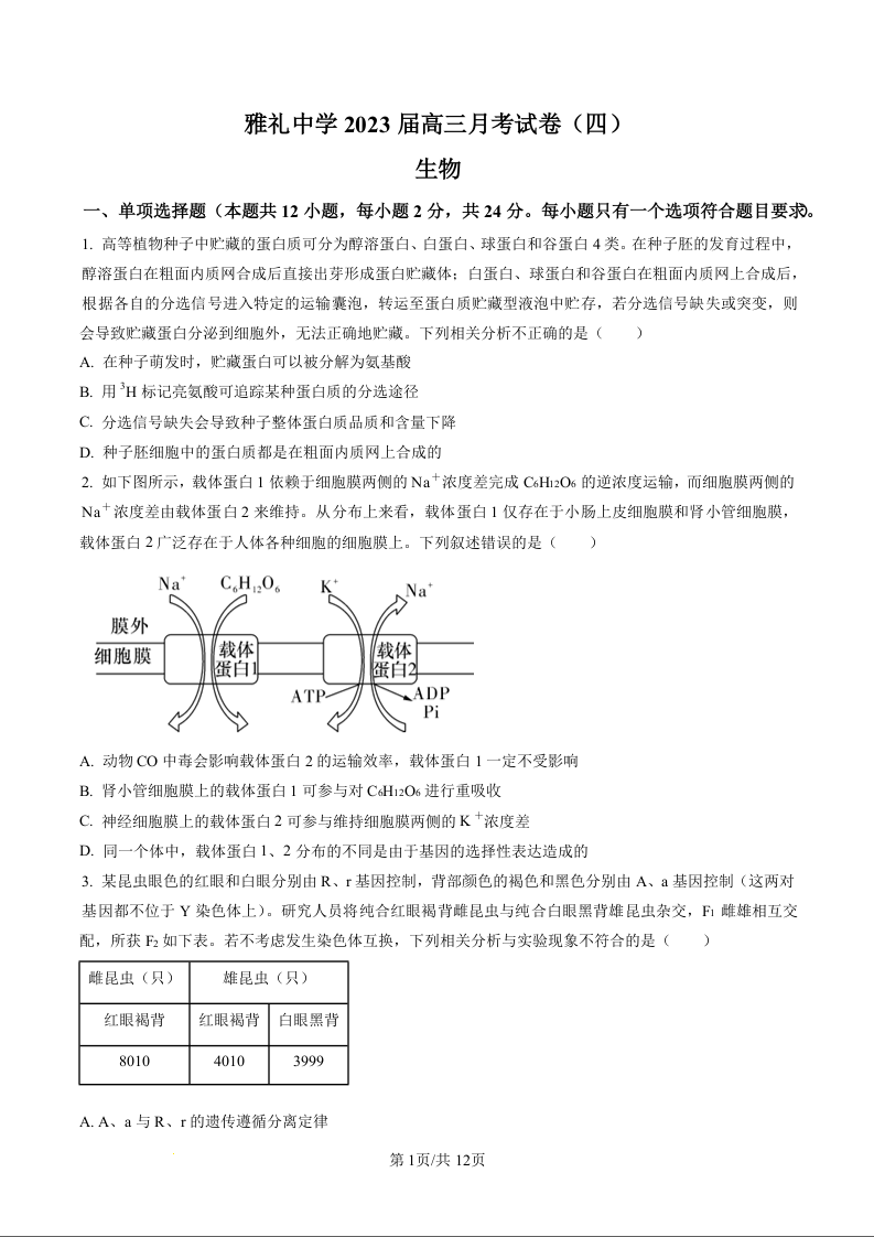 高三生物+答案-湖南省长沙市雅礼中学2022-2023学年高三上学期月考卷(四)