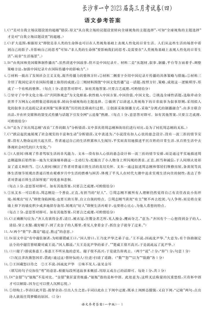 高三语文答案--湖南省长沙市第一中学2022-2023学年高三上学期月考(四)