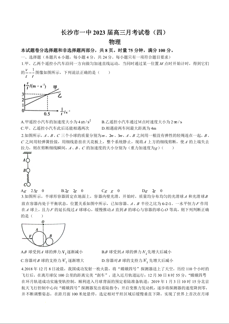 高三物理+答案-湖南省长沙市第一中学2022-2023学年高三上学期月考(四)