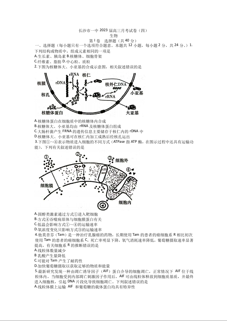 高三生物-湖南省长沙市第一中学2022-2023学年高三上学期月考(四)