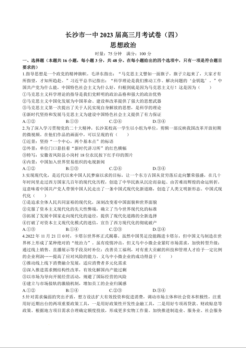 高三政治+答案-湖南省长沙市第一中学2022-2023学年高三上学期月考(四)