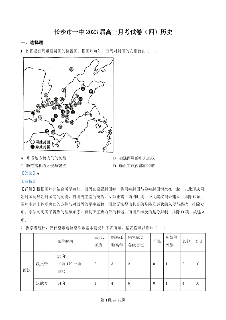 高三历史(精品解析版)-湖南省长沙市第一中学2022-2023学年高三上学期月考(四)